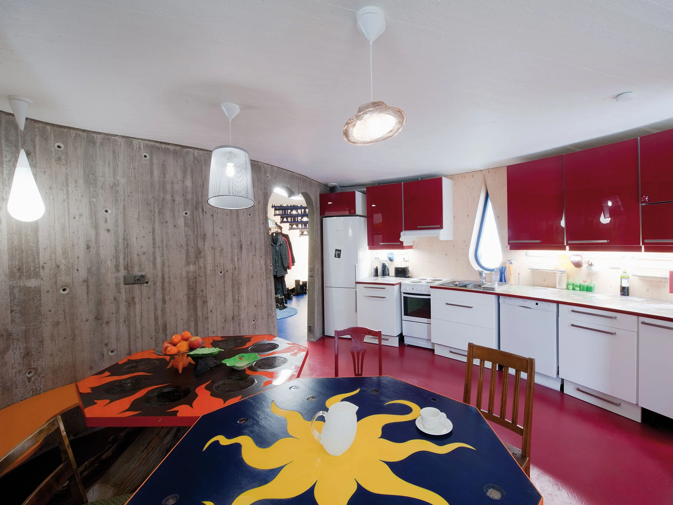 ”Sisällä vastakohdat ovat voimakkaammat kuin ulkona kun tila jännittyy betonibrutalismin ja leikittelevän koristeellisuuden välille. Keittiötä ja olohuonetta hallitseva aaltoileva teräsbetoniseinä – kuin 1950-luvun brasilialaista modernismia – haastaa koko muumimaailman.”
